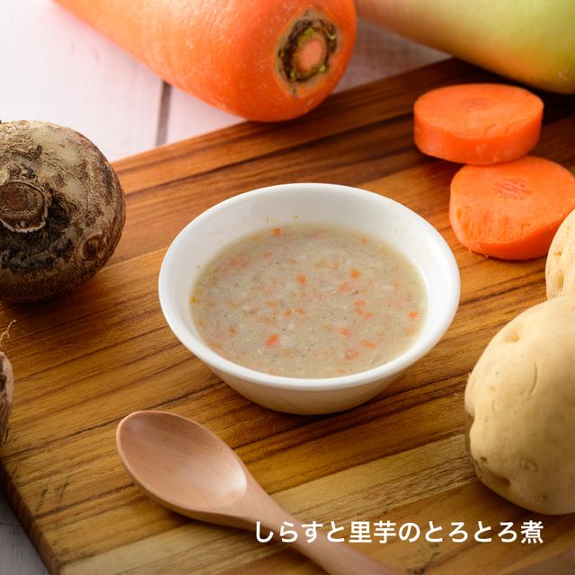 野菜(さといも、にんじん、じゃがいも、大根)(国産)、かつおだし、鶏肉ミンチ、焼きしらす、米粉でん粉、DHAオイル/クエン酸Ca、ピロリン酸鉄、V.D、(一部に鶏肉を含む)