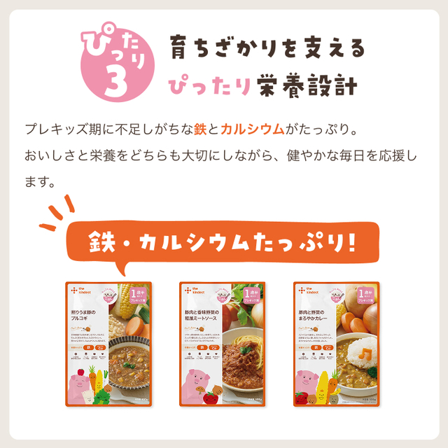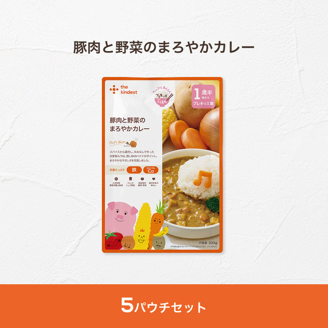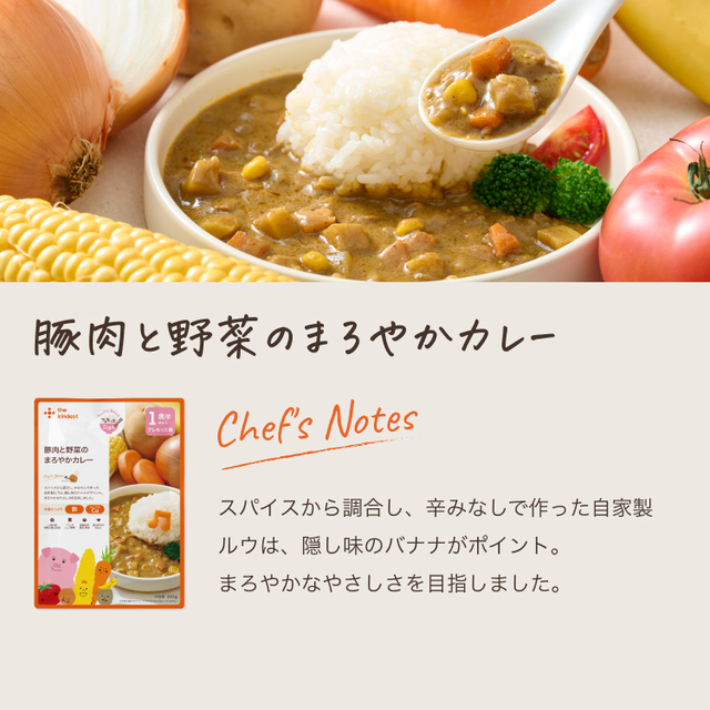 野菜(にんじん、玉ねぎ、じゃがいも、とうもろこし)、豚もも肉(国産)、カレールウ(植物油脂、小麦粉、バナナピューレ、香辛料、おろしにんにく、おろししょうが)、かつおだし、トマトピューレ、牛乳、本みりん、バナナピューレ、醤油、トマトペースト、食塩/グルコン酸Ca、ピロリン酸鉄、(一部に乳成分・小麦・大豆・バナナ・豚肉を含む)