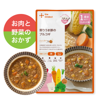 豚もも肉(国産)、野菜(白菜、玉ねぎ、にんじん、長ねぎ、とうもろこし)、りんごピューレ、オニオンペースト、醤油、本みりん、いりごま、えのき茸、米粉でん粉、ごま油、おろしにんにく/グルコン酸Ca、ピロリン酸鉄、(一部に小麦・ごま・大豆・豚肉・りんごを含む)