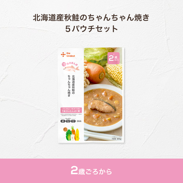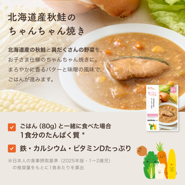 野菜(白菜、玉ねぎ、にんじん、とうもろこし)、さけ(国産)、本みりん、清酒、味噌、えのき茸、バター、米粉でん粉、しょうが汁、DHAオイル/グルコン酸Ca、ピロリン酸鉄、(一部に乳成分・さけ・大豆を含む)