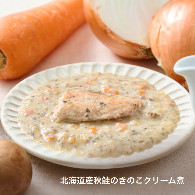野菜(玉ねぎ、にんじん)、さけ(国産)、牛乳、マッシュルーム、かつおだし、小麦粉、バター、植物油脂、食塩、DHAオイル、ガーリックパウダー/グルコン酸Ca、ピロリン酸鉄、(一部に乳成分・小麦・さけ・大豆を含む)