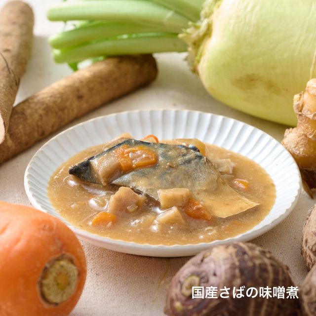 野菜(大根、さといも、ごぼう、にんじん)、さば(国産)、本みりん、清酒、味噌、かつおだし、米粉でん粉、しょうが汁/グルコン酸Ca、ピロリン酸鉄、(一部にさば・大豆を含む)