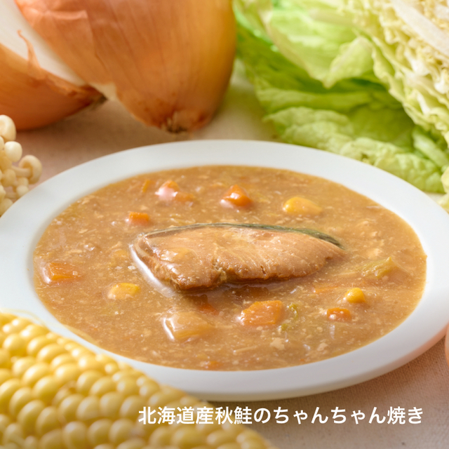 野菜(白菜、玉ねぎ、にんじん、とうもろこし)、さけ(国産)、本みりん、清酒、味噌、えのき茸、バター、米粉でん粉、しょうが汁、DHAオイル/グルコン酸Ca、ピロリン酸鉄、(一部に乳成分・さけ・大豆を含む)